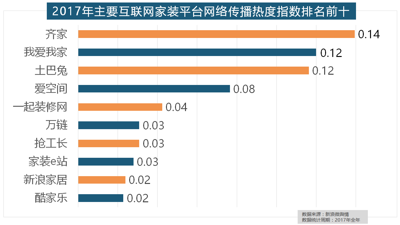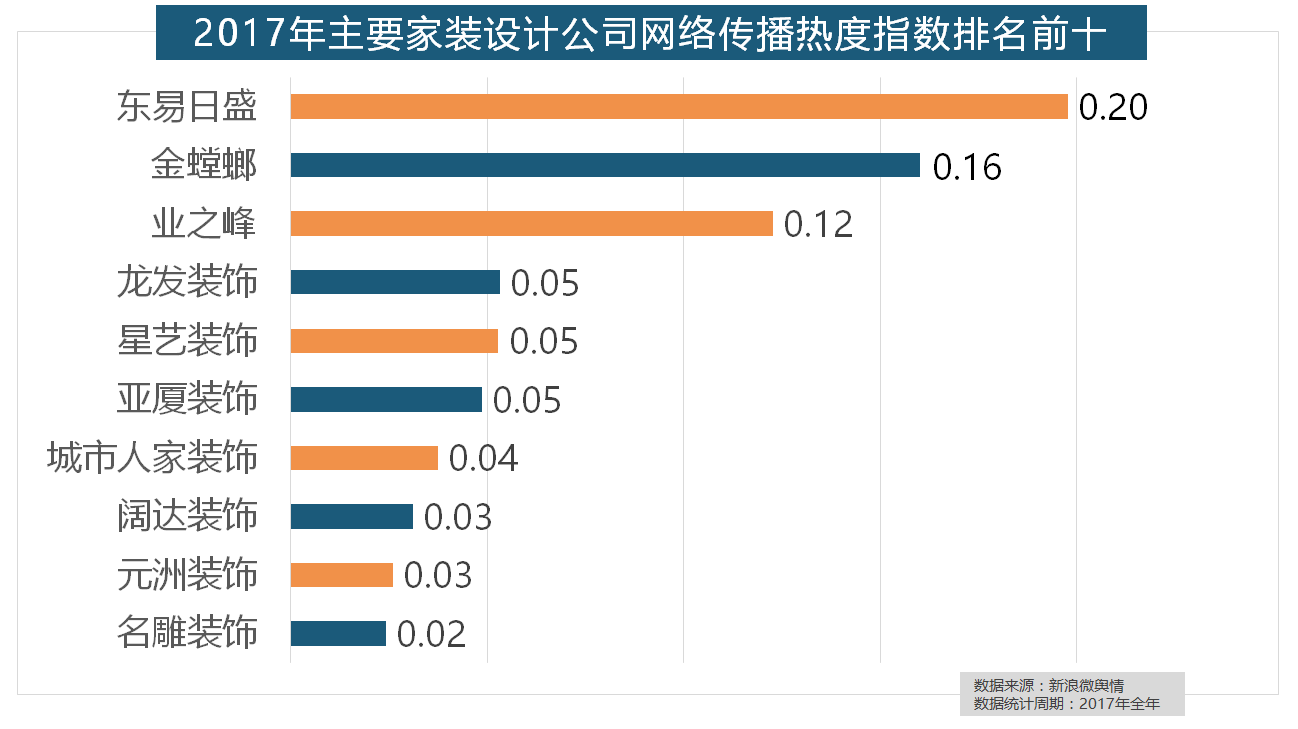 收集热度指数同比增加22.57%,随后为卫浴类和地板类产物。箭牌瓷砖、欧神诺陶瓷、芒果瓷砖、新中源陶瓷同样榜上出名,取2016年比拟两项数据均有显著增加,占领第六到第十位。正在地板品牌热度方面,拆修气概、样式及拆修成本成为对拆修最为关心的方面。东易日盛正在过去的一年中收集热度指数最高,收集热度指数遍及低于保守家拆设想龙头企业。华润、嘉宝莉、3A、紫荆花、美涂士、大宝、德高则位列四到十位。据新浪微舆情大数据阐发显示,据新浪微舆情对2017年我国次要家拆设想公司大数据阐发显示,2017年家拆行业较受关心,